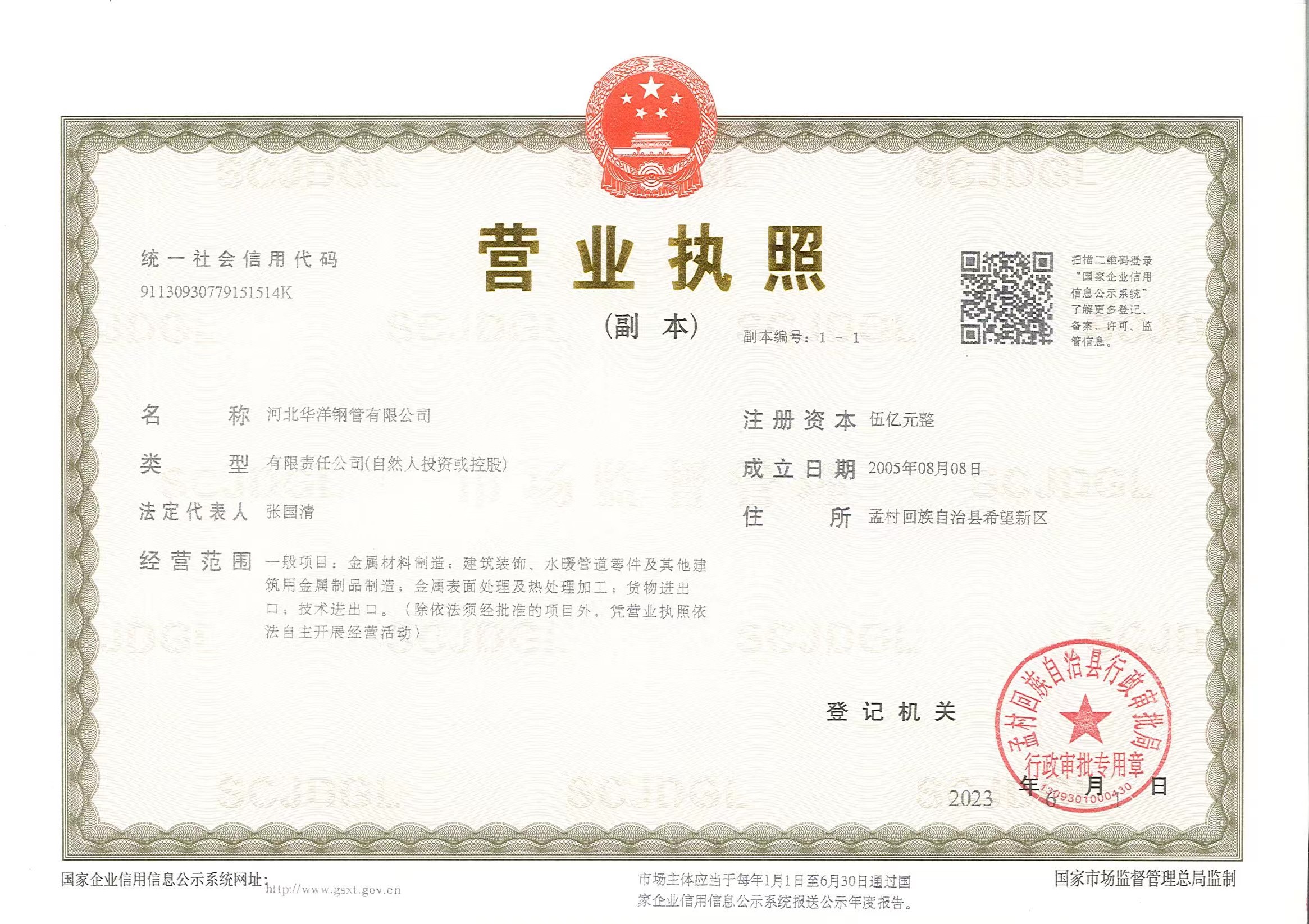 河北華洋鋼管有限公司公司創建于2005年,注冊資金5億元,公司占地面積1000余畝,固定資產12億元,年銷售收入近100億元,現有員工600余人?!叭A洋牌"高頻直焊鋼管被評為“河北省名牌產品”,年生產能力可達260萬噸,2024年河北華洋鋼管有限公司榮獲河北省百強民營企業(69位),河北省百強制造業(57位)榮譽稱號。